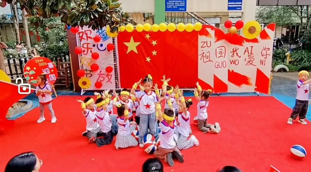 小一班、大一班、大二班的小精灵们化身为一个个小小艺术家!他们身着绚丽的服装,随着《勇敢小兵兵》、《篮球里的中国红》、《少年有志》等欢快的乐曲翩翩起舞。挺拔的身姿、酷炫的球技、憨态可掬的动作,每一个舞步都跳跃着快乐的音符,描绘出他们心中最美的祖国画卷。