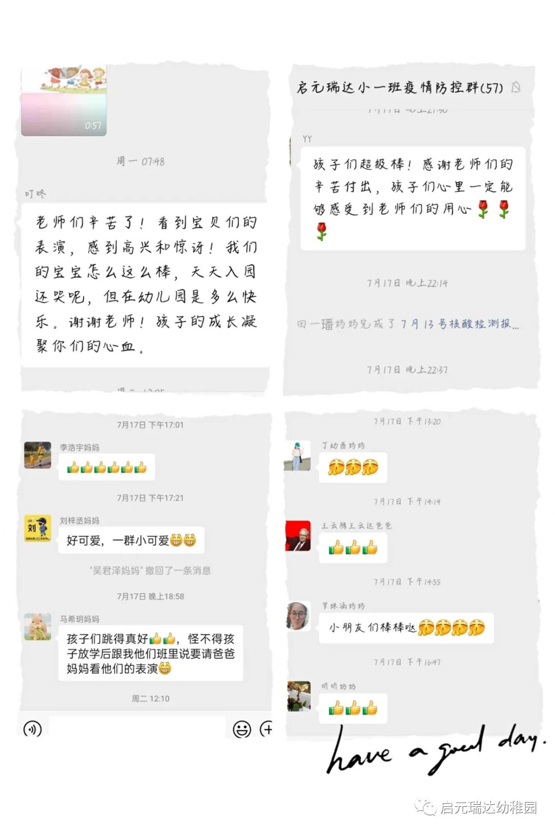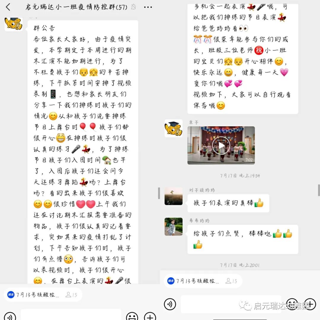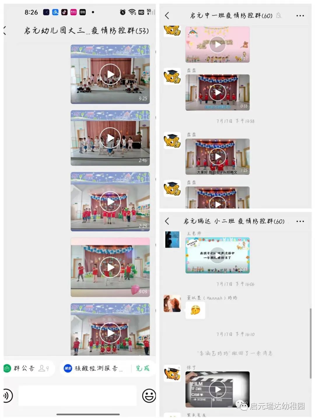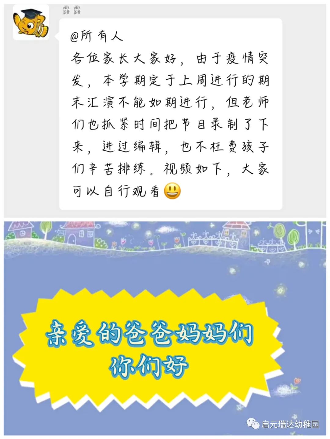 “聆听社会心声,顺其需而教”。不知不觉,又到了学期末,由于疫情防控的需要,我们不能相聚幼儿园见证孩子们的成长,但为了让每位家长了解孩子的学习、生活情况,切实感受孩子一个学期以来的成长和进步,启元哈哈鱼连锁幼儿园瑞达分园以“云汇报”的形式开展了学期教学成果汇报展示活动,让家长感受孩子们的点滴进步,见证他们的成长。