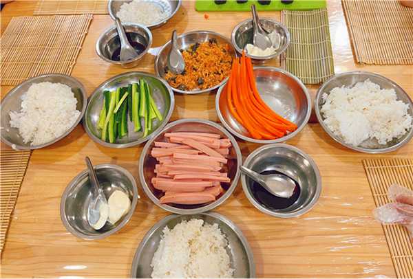 老师为小朋友准备了丰富的食材,有海苔、米饭、酱、黄瓜条、胡萝卜条、香肠条。一切准备就绪,宝贝们大显身手的时候到啦~
