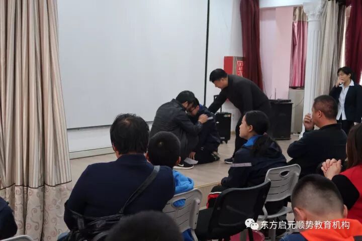这时,时垚众的爸爸也走上讲台,鼓励孩子,擦干眼泪!当爸爸走上讲台不到十秒钟,时垚众突然一下子跪在爸爸面前,哭着喊:“爸,我错了!”爸爸安慰他时,他紧紧抱着不放,长跪不起,一声接一声哭着喊:“爸爸,我真的错了!”