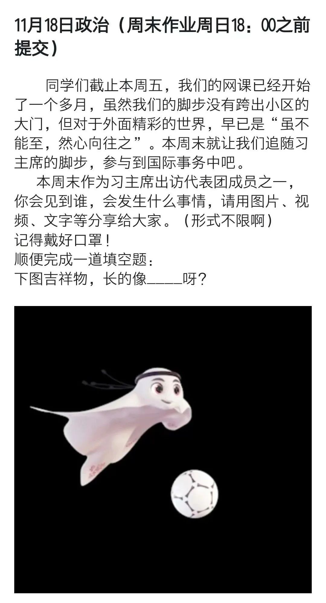 亲爱的同学们:记住把班级课程表贴在你的床头,记住调整好你的作息时间,尤其要记住按时提交作业,积极锻炼身体,严格要求自己!